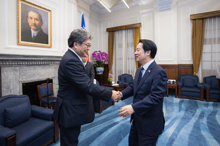 台湾を訪れた自民党の萩生田光一幹事長代行(左)は22日、台北の総統府で頼清徳総統と会談し、日台関係の強化で一致した。総統府が発表した。(総統府提供) 【時事通信社】