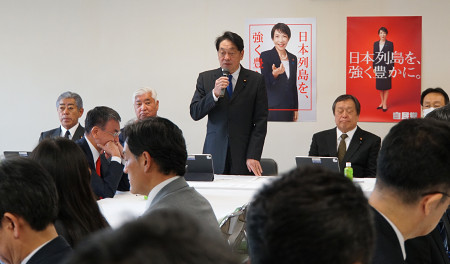 自民党安全保障調査会(小野寺五典会長=中央=)は20日の会合で、日本が輸出できる防衛装備品を「5類型」に限る現行ルールの撤廃に向けた提言の骨子案を了承した=東京・永田町の同党本部 【時事通信社】