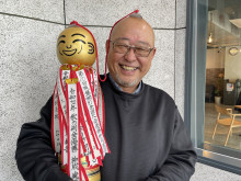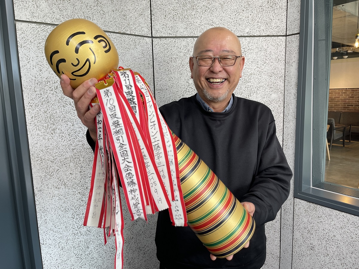 金色のこけしを手に笑顔を見せる大吉さん