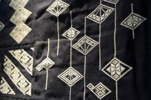 村上さんは「南部菱刺しを刺した経験はあったが、歴史や背景までは知らなかった」と話す。南部菱刺しは江戸時代の農民が麻布の衣を補強するために糸を重ねて刺したことが始まりだという。資料や過去の作品から南部菱刺しの歴史を学び、昔の人々の暮らしに思いをはせながらデザインを考案。大小さまざまな菱形を組み合わせた模様を施し、約5カ月かけて完成させた。かつて浅黄色の麻布に黒や白の糸で刺していた歴史を知り、それに着想を得て、紺色の布と「生成色」(黄みを帯びた白)の糸を使った。