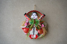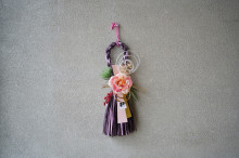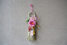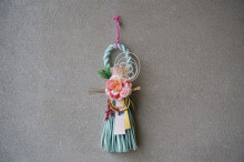 秋田さんが製作するしめ飾りは約10種類。わらの縄を使った一般的な「玉飾り」のほか、水色、紫、ピンクなどに染色した紙製の縄に造花をあしらった物、リース状の縄にたくさんの装飾を施した物など趣向を凝らす。大きな物は長さ80センチ、小さな物は長さ30センチほど。来店客のリクエストでアレンジを加えることもあるという。価格は720円~3,000円。