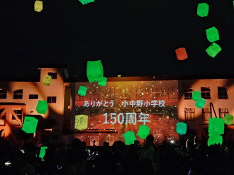 八戸市立小中野小学校(八戸市小中野5)の創立150周年を祝う「プロジェクションマッピング&スカイランタン」が10月7日、同校校庭で行われた。