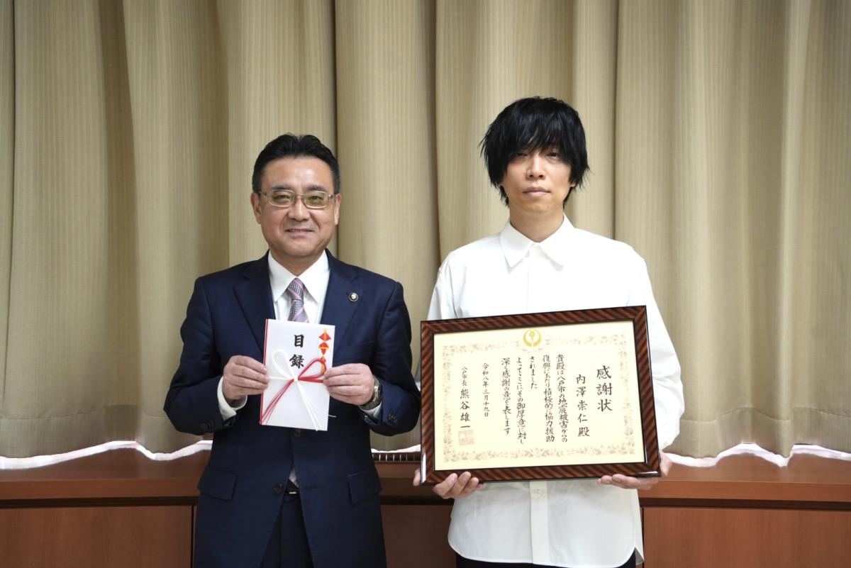 ロックバンド「androp(アンドロップ)」でボーカル・ギターを担当する内澤崇仁さんが3月19日、昨年12月8日に発生した最大震度6強を記録した地震からの復興に役立ててもらおうと、33万7,516円を八戸市に寄付した。