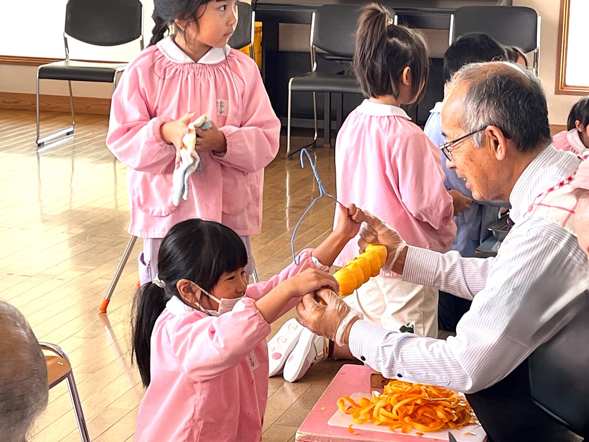 幼稚園児が収穫した渋柿を使った干し柿作りが10月30日、マリアンハウス幼稚園(八戸市是川)で行われた。