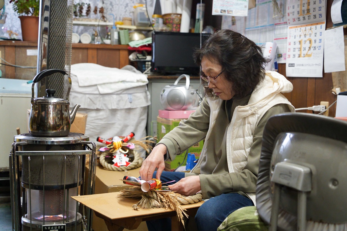 ストーブの前でしめ飾りを製作する秋田さん
