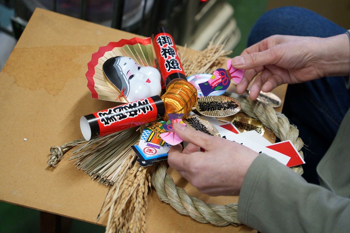 秋田造花店(八戸市十六日町)4代目店主の秋田恵子さんが現在、正月用しめ飾りの製作を進めている。