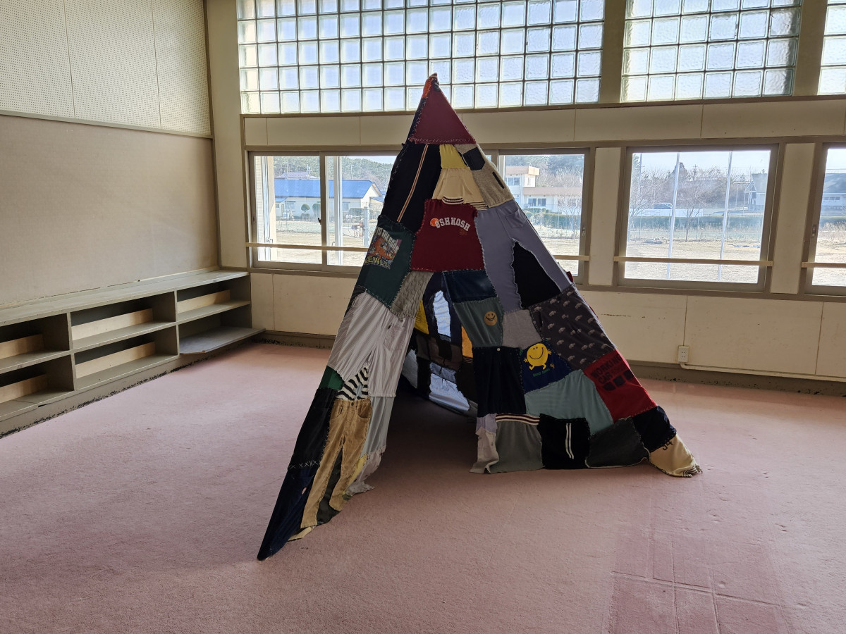 作品「プロペラはたんぽぽににて、とおくにむかって空をみつける」 ▼本文記事 アートイベント「she,see,sea,(シー・シー・シー)」が現在、旧三川目小学校(三沢市鹿中)で開かれている。